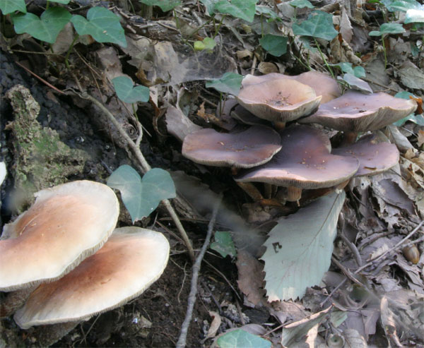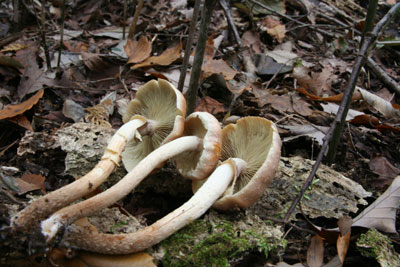 | 両端の個体にはつばらしきもの有り。(通常つばは無い) | 老菌になるとひだは黄色くなる個体も有る。11月18日 |