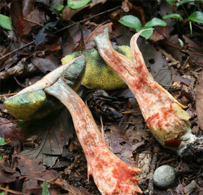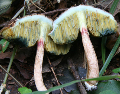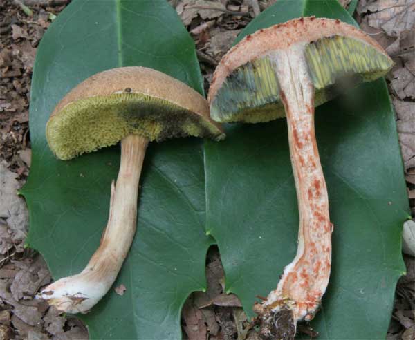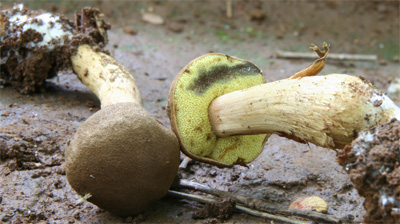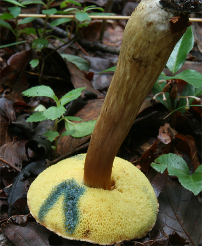 | 傘の肉は空気に触れると青変、柄は空気に触れ赤変後黒変 管孔は湾生 | 孔口を傷つけると青変、柄の基部には白色の菌糸塊 |