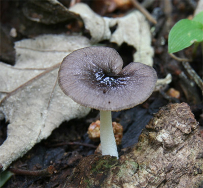 | コナラの倒木上に発生していた。小型の傘は淡灰褐色で中央部から紫黒色の粘性の脈状のしわが周辺に伸びる。 | ひだは成熟するとさび色 柄は白 |