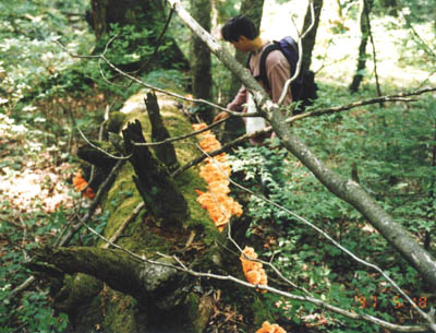 ブナの倒木に発生したマスタケを見つめるマスダ君