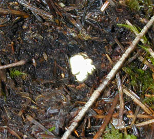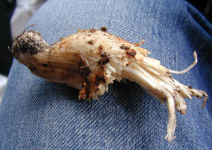 月10日 シロに成長を確認しに行ったが、去年と全く同じ場所に一個だけしか確認できず。地面より2cmの地中であり、1週間後にちょうど頭を出すか出さないかくらいの成長だろうと、予想したのだが・・・。9月16日 大雨の中、再びシロに行ってみたところマツタケの残骸が散らかっていた。 土を掘ってみたら、柄の下の部分だけが地中に残っていた。 犯人は?