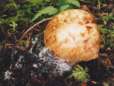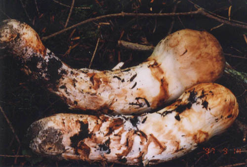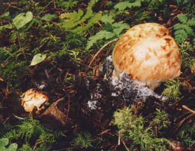 | 97年9月14日 去年マツタケを4本採ったシロに行ってみた。確か去年出ていた場所はこの辺だったとか友人と話しながら、きょろきょろ見まわしたがなにも見つからず、一瞬緊張がはしった。その直後友人の 「あったー」の声、なんとそれは友人の目の前にあったにもかかわらず、座り込んで30秒位は、気が付かなかったのです。 下の写真は写真を撮るためにコケを剥いた後の映像です。白い菌糸が付いています。去年の場所より山側に1メートル位ずれました。この年はこの二本だけでしたが、今になって思えばもう少し辺りをよく探しておけば、他にも2、3本あったのでは? | |