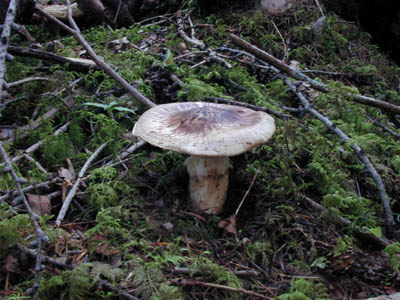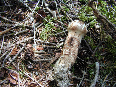 | 8月14日2002年 去年獲得したシロの場所の確認とヤマドリタケモドキを求めて、今年初めて、富士山に出かけた。 出発が遅れたため渋滞にはまり、八王子インターで中央高速に入るのに、いつもの倍かかり、スバルラインは、乗用車規制中となっていたので、林道の2合目辺りに車を停めて、歩いて5合目まで行くことになった、歩き始めたのは昼近く暑かったのと久々の山歩きとで、ヘトヘトでした。この日の山は非常に乾いていた、キノコはほとんど無い、あっても乾燥キノコばかりだ。見つけたキノコは、干乾びたショウゲンジ2個、腐ったヤマドリタケモドキ1個、食べ頃のドクヤマドリ1個、アンズタケとフジウスタケが少々にマツタケ一本でした。地元の人の話では、7月の終りころキノコは沢山発生したそうですがその後雨が降らず、だめな状態が続いてるそうです。9月に入ったらお湿りの状態を確認して、3回はマツ狙いで出かけるつもりです。とりあえず、6番目のシロ。 ラッキーでした。 | |