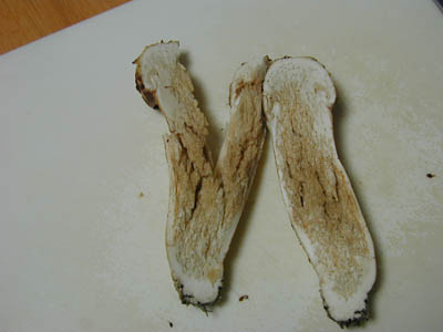 | すき焼きです。 ホウキタケの柄のスライスを入れてみました、マツタケの香りがホウキにも移りシャキシャキ感のある偽マツタケがボリュームを増やし、味もグッドです。 | ホイル焼きです。 美味しいのですが、だんだんマツタケの香りが鼻についてきます。 |