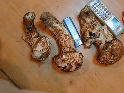 | この時期に、2週間もシロをほったらかしにしてはいけません、飛び出していました。この日は、マツタケはこの場所の3本だけでした。 来年もこのシロで採れると良いのですが・・・・。 この日の他のキノコの収穫は、、ナラタケ、ヌメリササタケ、ハナイグチ、キノボリイグチが沢山と、クロカワ小さいのが3個とショウゲンジとホウキタケが数本でした。 |