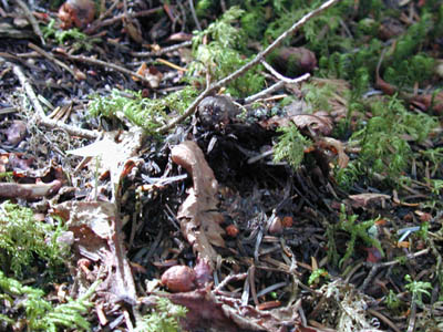 | 先週3本採ったシロで、辺りを手で押し地下のマツタケの発生は今年は無いと確信していたのですが・・・・。このマツタケを掘り出してみると、地下には白い菌糸がたっぷり在り、小さな子実体と思われるものもできかけていた。来週は行けないので、これらが成長しないことを願う。このシロにおいて、今年は3週に渡り6本目となり98年の記録と並びました。 | こんな物出てました。 開いているマツタケは、6年ぶりです。 6年前のものより小ぶりです。 7番目のシロとなります。 |