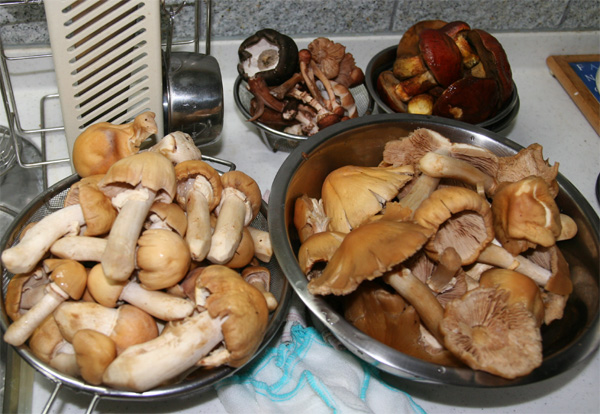 | 本日の収穫 ↑ この他には食べごろのショウゲンジ多数、ヌメリササタケ、ナラタケ、チャナメツムタケ、小株のホンシメジ、クロカワ少々 |