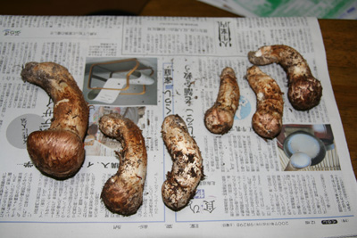 | 地面が盛り上がっているのに気づいた。しかし友人がこちらに向かって数人の人が近づいてくるのに気づいた(耳の悪いオレに聞こえなかったが)。 この程度の盛り上がりでは気づかれないと確信したので、その場を一度離れた。 | しばらくして戻り、掘ってみると小さいが5本育っている。3本残して埋めておきました。 腐ってしまうか、それとも成長すのか? シロ(96)にて |