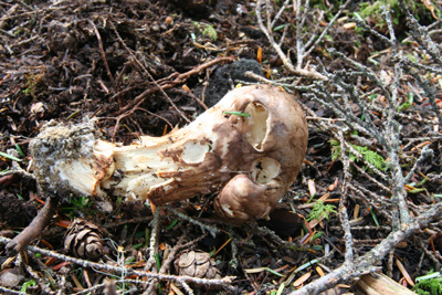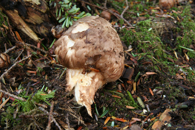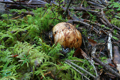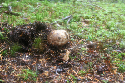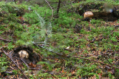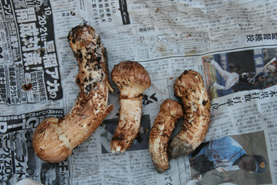 | 今シーズン非常に少なかったショウゲンジが今頃になって沢山で始めました。全シロを雨の中、見回りましたが、先週三本残して置いたシロのみでの収穫となりました。本日の収穫はショウゲンジを中心にハナイグチ多数、オオツガタケ(幼菌)10本、クロカワ1本、マツタケ6本でした。大きいもので100g、残りは50g前後の小型のマツタケでした。 雨の中での撮影のためレンズに水滴が付いたり曇ったり、また近くに人もうろうろしていたので、少ないカットでのきのこ撮りとなりました。 | |