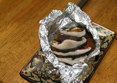 | クロカワのホイル包み焼き ↑ | この料理、作者の小二の子供が明日のお弁当に入れて欲しいと言ったくらい美味いです。ノンベーにはこの苦味と卵のまろやかさが合ってしまう。 作者は酔ってくると、奇抜なレシピが浮かび実践しますが、記録者がいないと夢の中のレシピとなってしまいます。 酔払いの弁として、次回はクロカワチャンプルーだそうです。 |