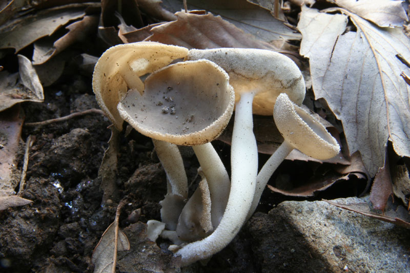 落ち葉の間からチャワンタケの仲間が顔を出していた、落ち葉を取り除くと柄が長く伸びていた。よく見ると傘の裏と柄には細かい短毛に覆われている。ノボリリュウタケ科は頭が丸型や鞍型などのおもしろい形を持つが、水分の保持力などと関係があるのだろうか?