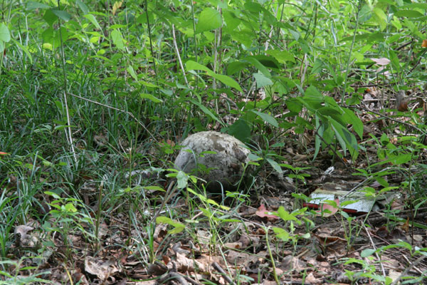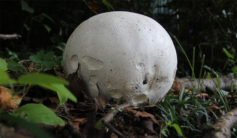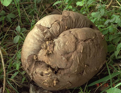 | 少し開け草地で、バレーボールを一回り大きくしたくらいのサイズのものを、3つ発見した。食えるらしいが、食べたいと思わない。薄暗い森の中で出会ったら、不気味だろうが、発生環境はやや明るい草地のようだ。 | |