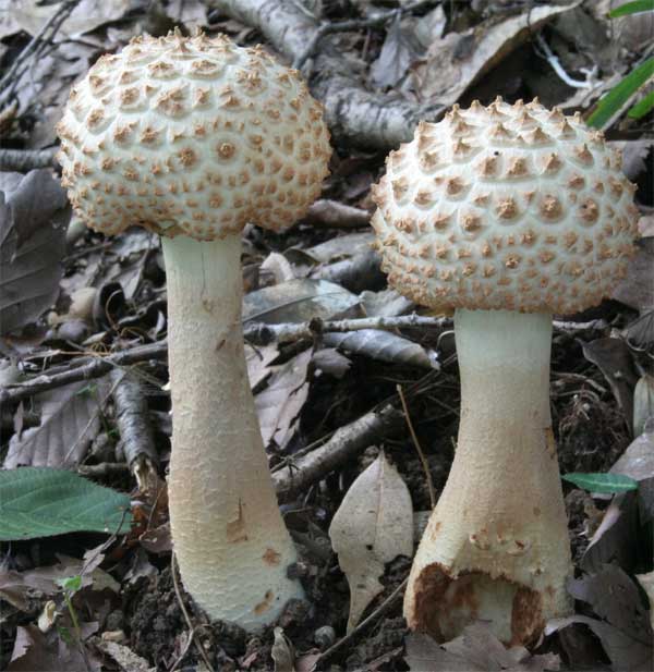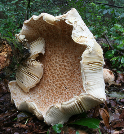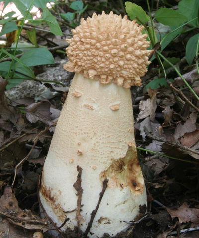 | シロオニタケの大きいものはよく見るが、このクリーム色を帯びたキノコ、発見当時には名前が分からなかった。 この場所には10個ほどの発生を確認した。 | |