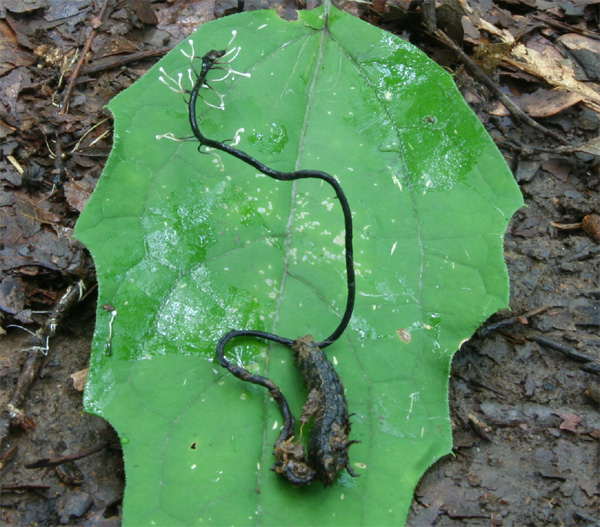 | 成虫に発生したものより黒い針金状の主柄が長いのは、 おそらく幼虫は成虫にくらべ寄生された時の場所が地下やや深いためと思われる。 |