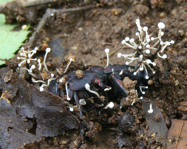 | ただのオサムシタケだと思い、一枚だけカメラに収め家でパソコンで見てみると、寄主がどうもオサムシではないようだ。 クワガタかな??? |