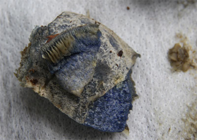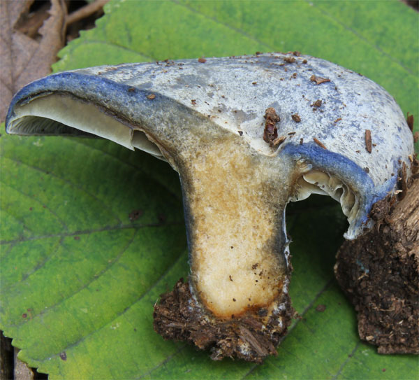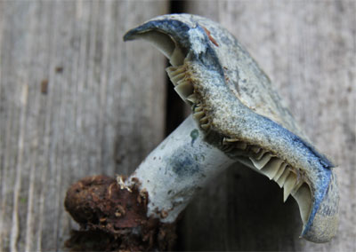 | 柄も傷付けると藍青色に変わる | 傘の表皮を剥いでみると濃い瑞瑞しい濃い藍青色が現れる |
