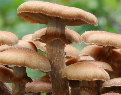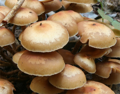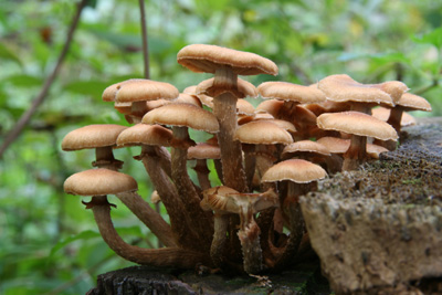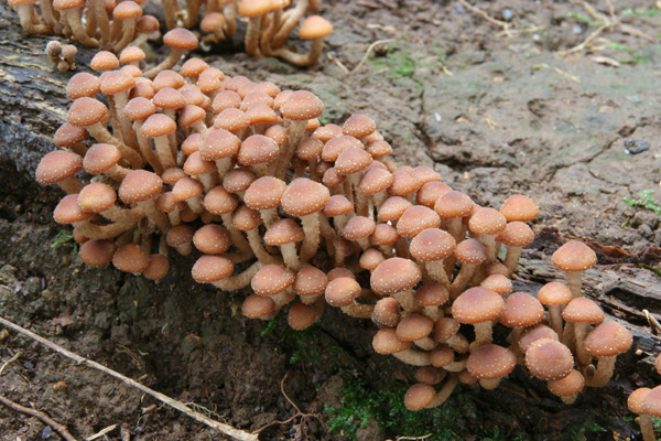 | 切り株や、地表面を走る根から多数群生する小型から中型のキノコ | |