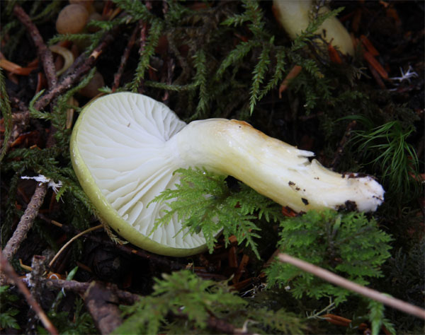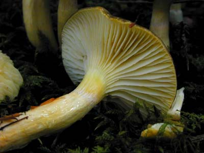 | 針葉樹林のコケ上に発生する、傘の径5センチ前後 | 柄には、薄っすらと白いつば残りがあり、それより下部には、ぬめりがある。 |