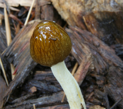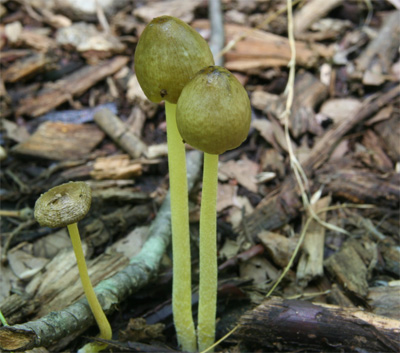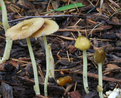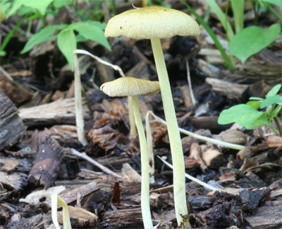 入梅の頃ウッドチップの蒔かれた場所などに発生する小型のキノコ