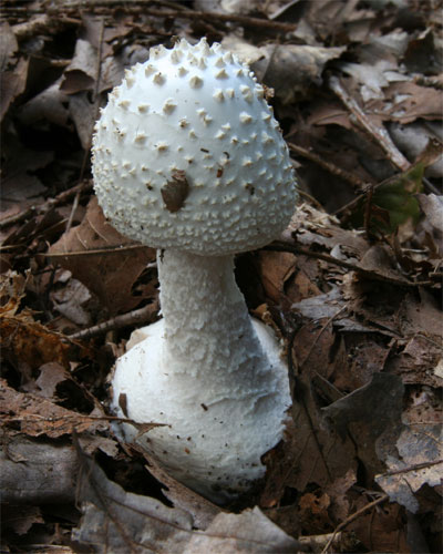 中型のキノコで、傘に角錐状のいぼを付着する。