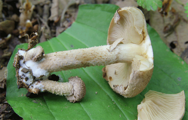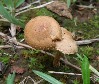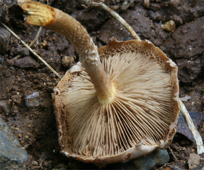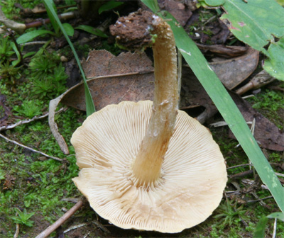 | 傘の表面はクリーム色〜麦わら色 淡褐色の鱗片を散布 | ひだは直生 やや密 傷つけるとやや濃くなる |