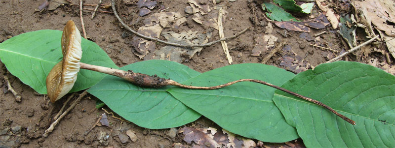 | キノコを真上に慎重に引き抜くと土の中に深く入り込んだ長い柄が、出てくるので面白い。こんどは、もっと長いのを探して、ギネスブックに載せよう。 | |