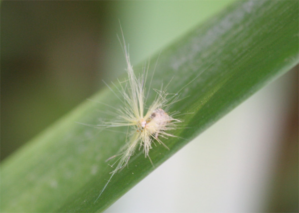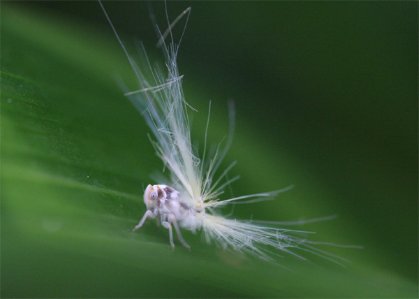 一見すると、タンポポなどの綿毛状の種子が葉の上に付着しているようです。鳥などに食べられてしまうのを防ぐためとしてはあまりにも大げさな羽衣を身に付けています。