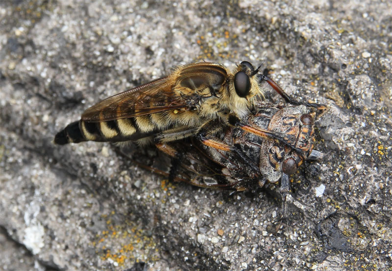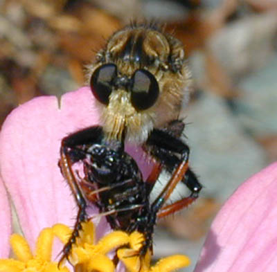 | 甲虫が花の蜜を吸っている間にアブに、体液を吸われてしまった。 抱えられている甲虫の頭の付け根にアブのストローが突き刺さっている。実はモニターで見るまでこの事態に撮影者は気がつかなかった。 |