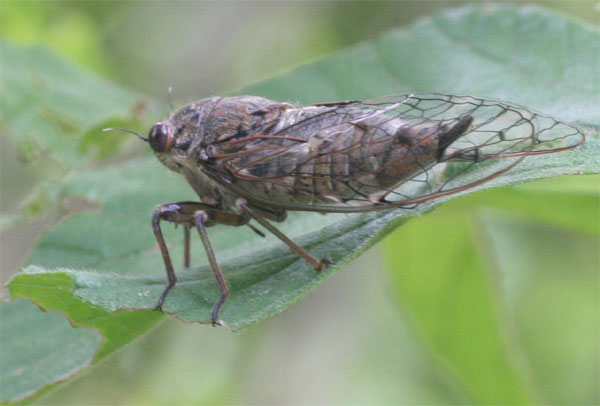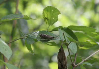 | ツクツクボウシよりやや小型で、黒っぽく目立たない。 なぜか、このセミは葉の上で風にゆられていたので、セミと判った。どうやら♀のようだ。 |
