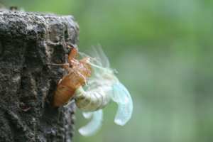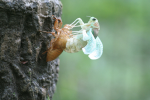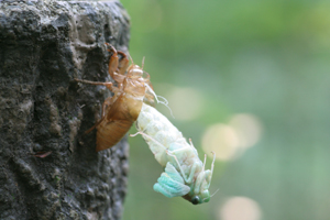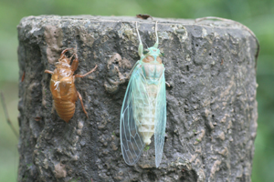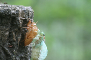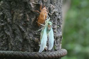 | アブラゼミの羽化は何度もみていますが、ヒグラシの羽化を見たのは初めてです。 透明になる前の青っぽい翅の色がきれいでした。去年はヒグラシのメスに寄生するセミヤドリガを沢山見ました。 地中の7年を経て、やっと華やかな世界に飛び立つ準備完了だが、 この後にも子孫繁栄のための大一番が待ち受けているのでしょう。 | ||