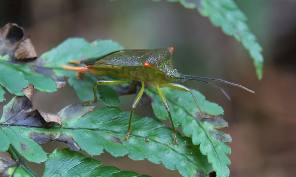 お尻にオレンジ色のハサミをもっている。小春日和の日に薄暗い斜面のシダ類の上で休んでいた