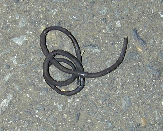 | ハラビロカマキリ : オオカマキリより小型だが、カマの力が強く胴体が太く動きも機敏なため、子供の頃は、木の上などで、このカマキリには、痛い目によく合わされました。先日犬の散歩中に、路上で頭を車に踏まれているハラビロカマキリを発見した、その脇に、二つに切断された全長20センチ位のハリガネムシがもがいていました。その動きはまるでヒルの様でした。こんな大きな寄生虫がこのカマキリのお腹に住んでいたと考えると不思議です。ハリガネムシは水辺で卵を産みます。卵から生まれボウフラに寄生し、羽化した蚊がバッタなど食され寄生し、その後それらを食したハラビロカマキリやカマドウマに宿替えするそうです。寄生されたカマキリは体内で十分に成長したハリガネムシに操られて水辺に向かいます。カマキリが水に触れると体を破って出てきて水中に卵を産むそうです。このカマキリは池まで5メートルの所で車に頭を潰されました。二時間後写真を撮りに行って見ましたが、ハリガネムシも卵を産めずに絶命していました。ハラビロカマキリを捕まえたら水に付けてみてください、ハリガネムシに会えるかもしれませんよ。またハリガネムシは塩素に強く、1mg/l 程度の濃度では死滅しないそうです、時々水道の蛇口から生きた状態で出てくるそうです。 ハリガネムシの動画へ | |