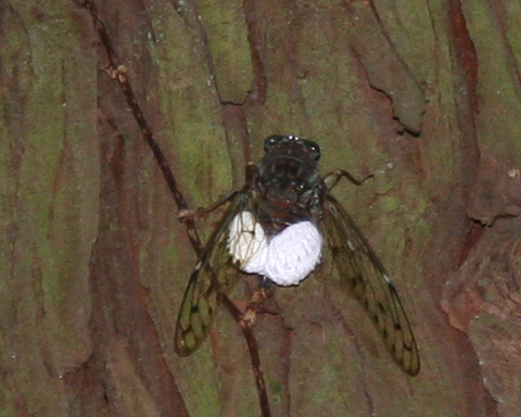| ネットで調べて、セミヤドリガの幼虫に寄生されたヒグラシと判明した。 撮影しようと接近すると他のセミ同様に他の木に飛び移るので、なかなか近くに寄れなかった。 この白い色は薄暗いスギやヒノキの森の中であっても遠くからよく目立つが、これだけ飛べれば鳥などに襲われないのかも? 白い綿状の物がセミの両側に付着しているので、ガもセミの飛行バランスが崩れないように考えて寄生しているのかな・・・・と考えていたが、後日↓のようなセミの羽が閉じなくなるまで、大きく育った個体をみた。 このガの寄主(ホスト)は99%がヒグラシであり、雌が多いそうです。しかし寄生は雌のヒグラシの産卵や寿命には影響しないそうです。? 寄生者のガの幼虫はセミが生きていられる2週間ほどの間に成虫となり、その間にその後の繁殖のため栄養分をセミの体液から頂いてしまうのです。 その証拠にガの成虫の口器などは退化しているそうです。 |
