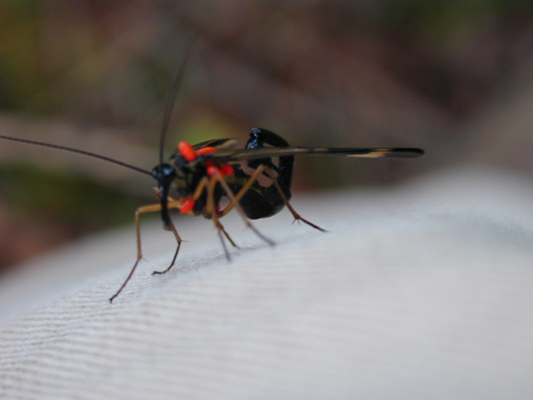 キノコを探していたら赤い色の目立つ昆虫が飛んでいた、何だろう思い追いかけていたらズボンの上で止まったので撮影した。赤い塊は何なんだろう?卵? 寄生虫?