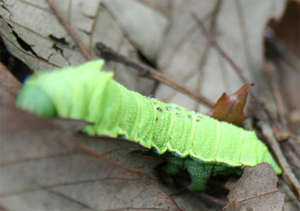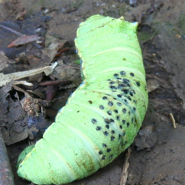 | ウスタビガの幼虫です。 背中の黒い斑点は寄生虫が脱出した痕だそうです。 ↓ 本当かな? | |
