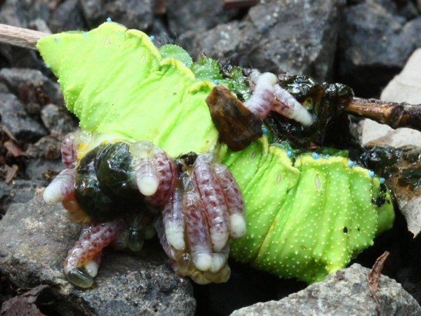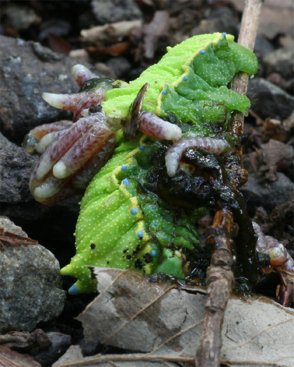 | コマユバチの仲間に寄生され、彼らがウスタビガの幼虫の体内で育ち、マユを作るために体外へ皮膚を破り出てきたところです。 6月15日 ↓ | |
