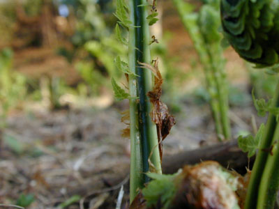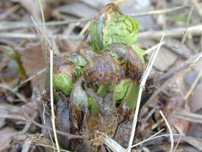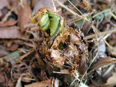 | 3月末に株の表皮を破ってみたら芽がスタンバイしていた。 | |