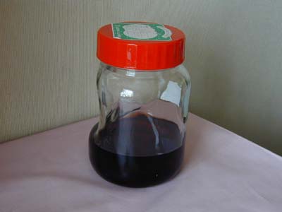 | 完熟した実を焼酎付けにしてみたが、味はイマイチ。半熟果を三分の一入れると味が良くなると聞いたが。 一年漬けたクワ酒 |