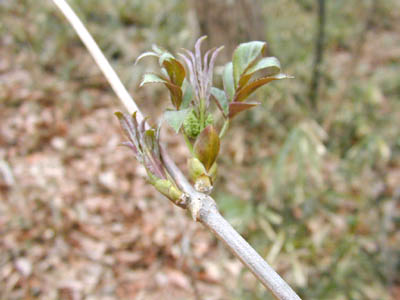 | 芽は対に発生するが、一対ずつ時間差を置いて発芽しいてるように思われる。発芽時期の早い植物なので、霜で一対の芽がだめになっても後発の芽が、カバーする仕組みなのか? | |