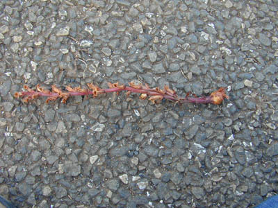 | 寄生か腐生植物の仲間であることは、すぐに分ったが、じぶんの持っている図鑑には載っていなかった。帰化植物だそうだ。 マメ科やせり科キク科の植物に寄生する。辺りにはヨモギがあったので、これが宿主であることが推測できるが確認はしていない。 植物は通常、土壌から水と無機物を吸収し、光と二酸化炭素でデンプンを合成して、生きていくが、この植物は他の植物が光合成し作り出した有機物を頂くので、自分では葉緑体を持たない。(だったら、こんなに日当たりの良い所でじゃなくても・・・・) 他にも、寄生植物ではオニク、腐生植物では、オニノヤガラやギンリョウソウなどがある。 |